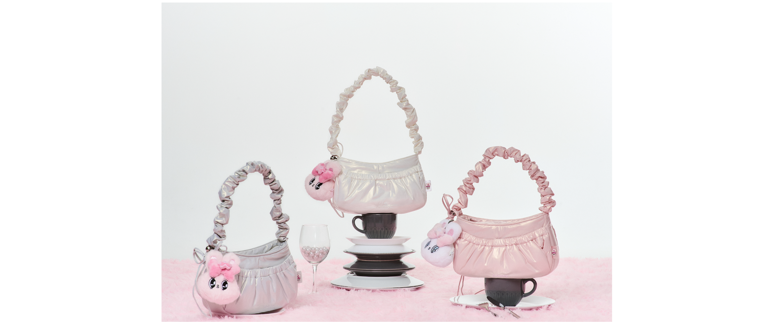 RM x Esther Bunny 肩背包以珠光尼龍材質打造,外觀柔和且帶有浪漫的珍珠光澤。可調式的抽繩肩帶,隨心所欲轉換肩背或斜背風格。正面有品牌刺繡 LOGO,並附有艾絲樂零錢包吊飾。內部設計包含拉鍊夾層與卡片夾層,空間足夠容納 15 Pro 手機,是一款兼具實用性與時尚感的單品。