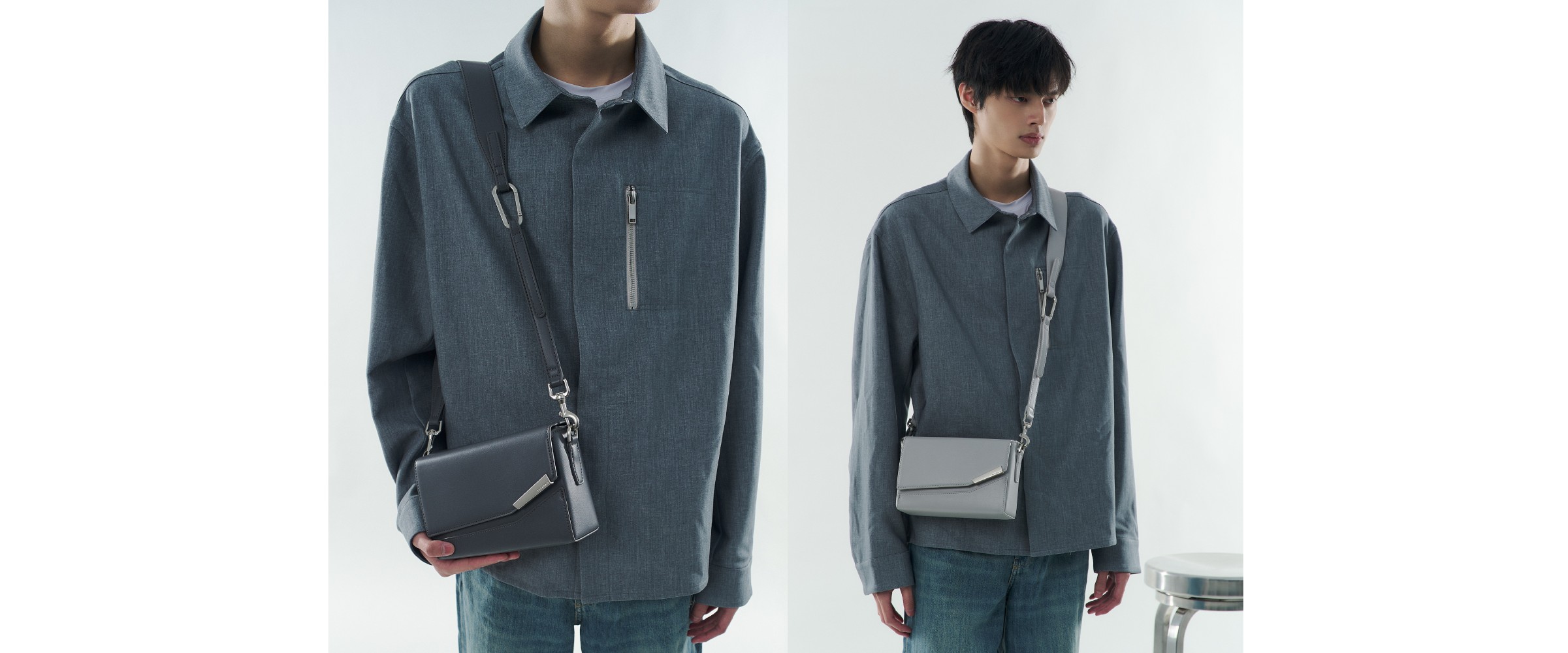 若你平時不常換包,需要一款百搭,每天都能背出門的包款,在此強烈推薦你艾利塔斜背包!簡約俐落的包型,搭配時尚金屬切角標誌,在細節處展現個性的同時,又能完美的融入每一套日常穿搭。艾利塔斜背包有出兩種灰色,水泥灰與霧灰。喜歡乾淨輕盈感的穿搭,可以選擇右圖的霧灰色;而喜歡個性獨具色彩的穿搭,則是可以選擇左圖的水泥灰做搭配。
